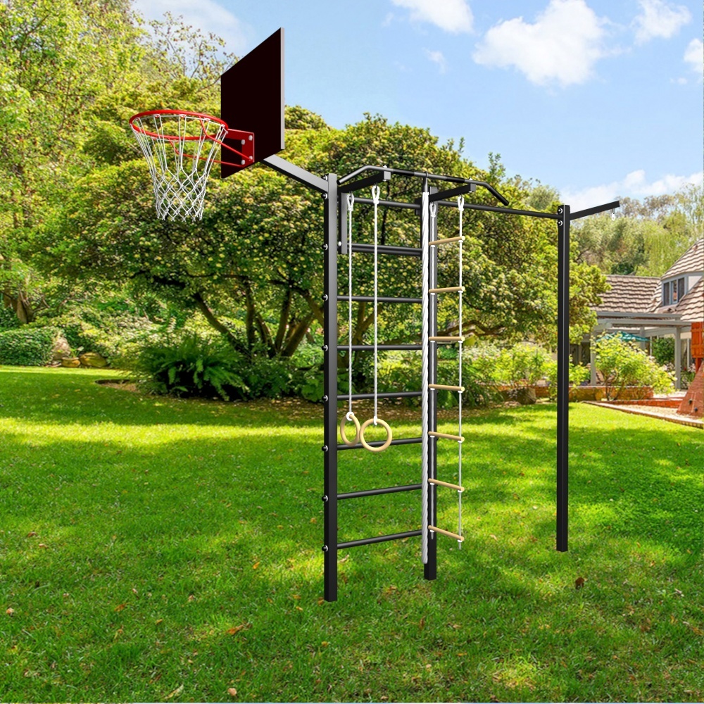 - Комплект: канат с крепежом, кольца гимнастические деревянные, лестница веревочная