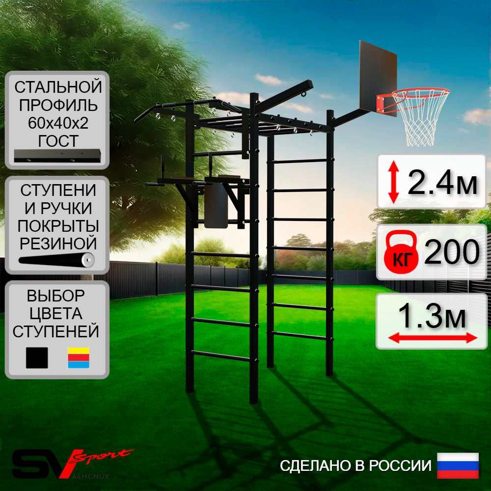 КОМПЛЕКТАЦИЯ: Каркас УСИК Sv Sport Рукоход, Турник Sv Sport стандарт к УШС, Брусья Sv Sport к УШС, Щит баскетбольный Sv Sport c кронштейном к УШС Sv Sport, Кронштейн для подвеса боксерского мешка Sv Sport.