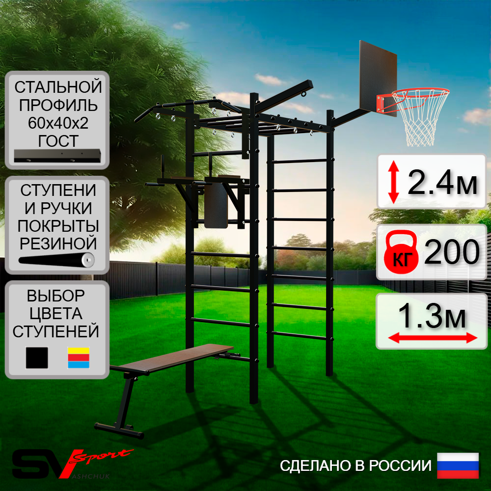 КОМПЛЕКТАЦИЯ: Каркас УСИК Sv Sport Рукоход, Турник Sv Sport стандарт к УШС, Брусья Sv Sport к УШС, Скамья для пресса и жима Sv Sport к УШС, Щит баскетбольный Sv Sport c кронштейном к УШС Sv Sport, Кронштейн для подвеса боксерского мешка Sv Sport.