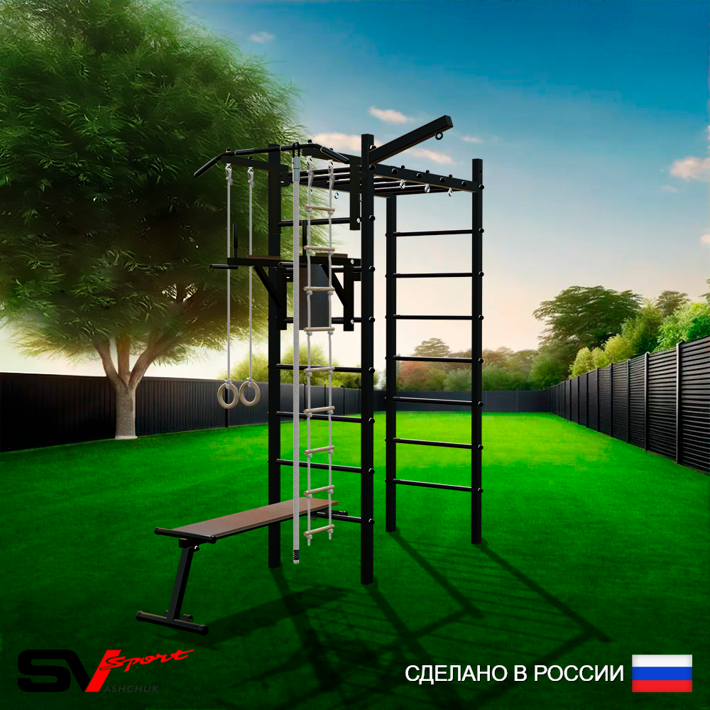 КОМПЛЕКТАЦИЯ: Каркас УСИК Sv Sport Рукоход, Турник Sv Sport стандарт к УШС, Брусья Sv Sport к УШС, Скамья для пресса и жима Sv Sport к УШС, Кронштейн для подвеса боксерского мешка Sv Sport, Kанат, Kольца деревянные, Лестница веревочная.