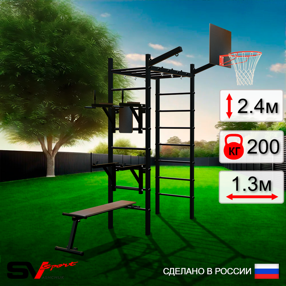 КОМПЛЕКТАЦИЯ: Каркас УСИК Sv Sport Рукоход, Брусья Sv Sport к УШС, Стойка под штангу Sv Sport к УШС, Скамья для пресса и жима Sv Sport к УШС, Щит баскетбольный Sv Sport c кронштейном к УШС Sv Sport, Кронштейн для подвеса боксерского мешка Sv Sport.