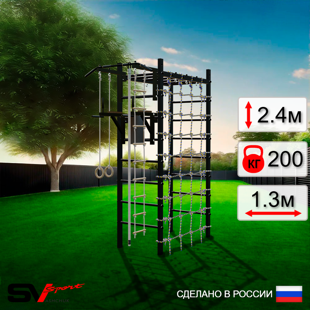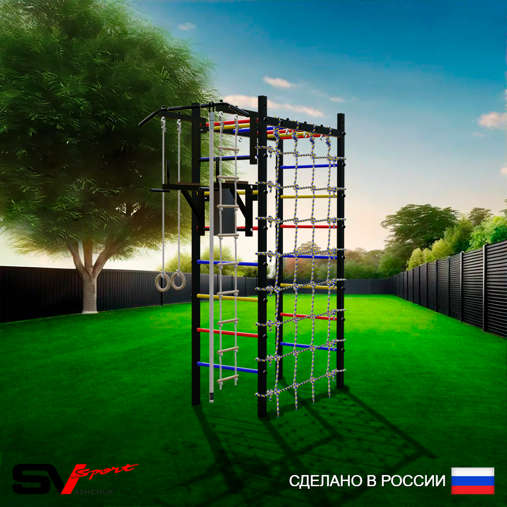 КОМПЛЕКТАЦИЯ: Каркас УСИК Sv Sport Рукоход, Турник Sv Sport стандарт к УШС, Брусья Sv Sport к УШС, Kанат, Kольца деревянные, Лестница веревочная, Сетка к спортивному комплексу.