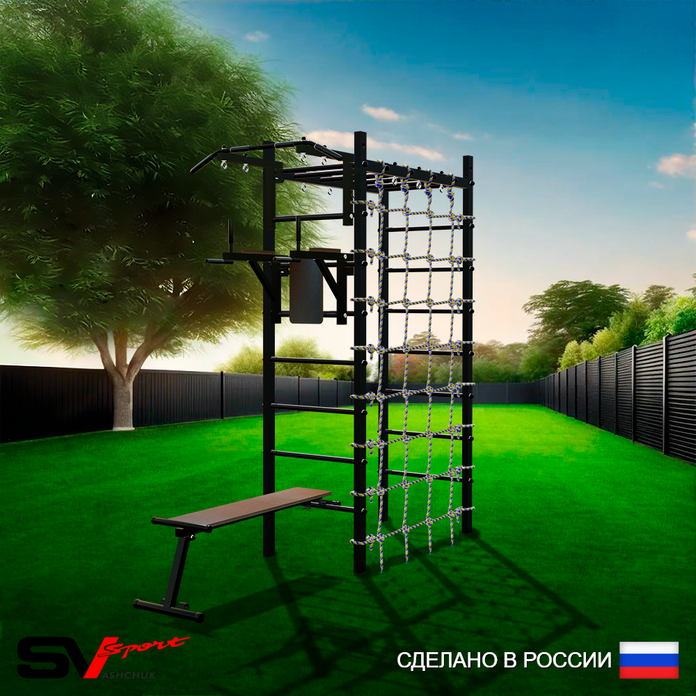 КОМПЛЕКТАЦИЯ: Каркас УСИК Sv Sport Рукоход, Турник Sv Sport стандарт к УШС, Брусья Sv Sport к УШС, Скамья для пресса и жима Sv Sport к УШС, Сетка к спортивному комплексу.