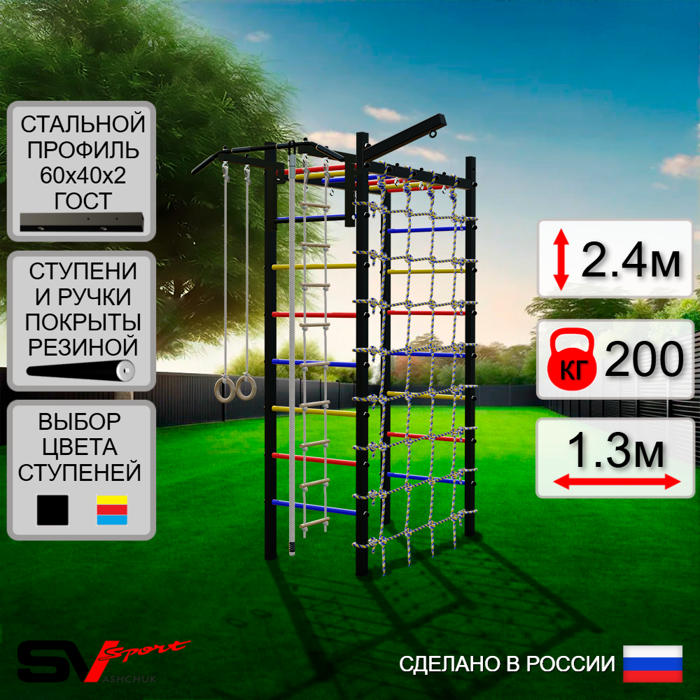 КОМПЛЕКТАЦИЯ: Каркас УСИК Sv Sport Рукоход, Турник Sv Sport стандарт к УШС, Кронштейн для подвеса боксерского мешка Sv Sport, Kанат, Kольца деревянные, Лестница веревочная, Сетка к спортивному комплексу.
