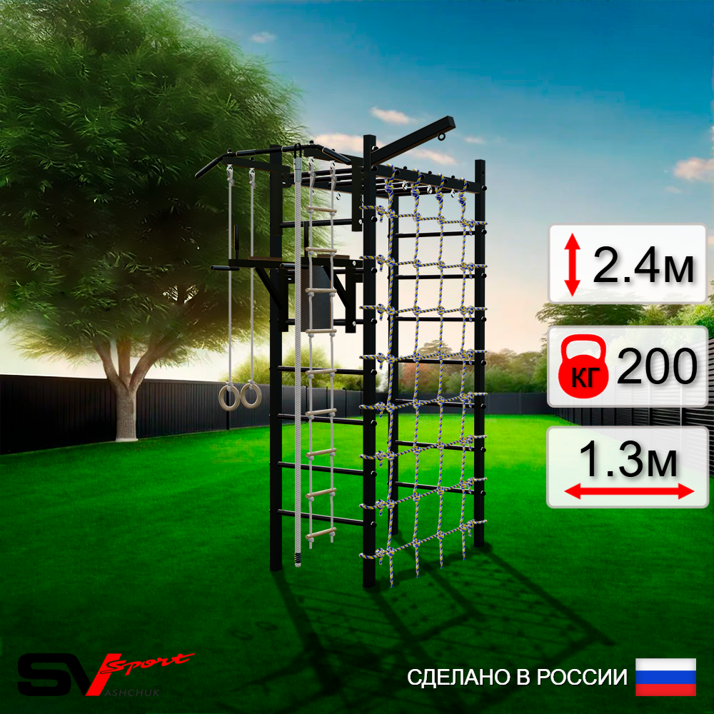 КОМПЛЕКТАЦИЯ: Каркас УСИК Sv Sport Рукоход, Турник Sv Sport стандарт к УШС, Брусья Sv Sport к УШС, Кронштейн для подвеса боксерского мешка Sv Sport, Kанат, Kольца деревянные, Лестница веревочная, Сетка к спортивному комплексу.