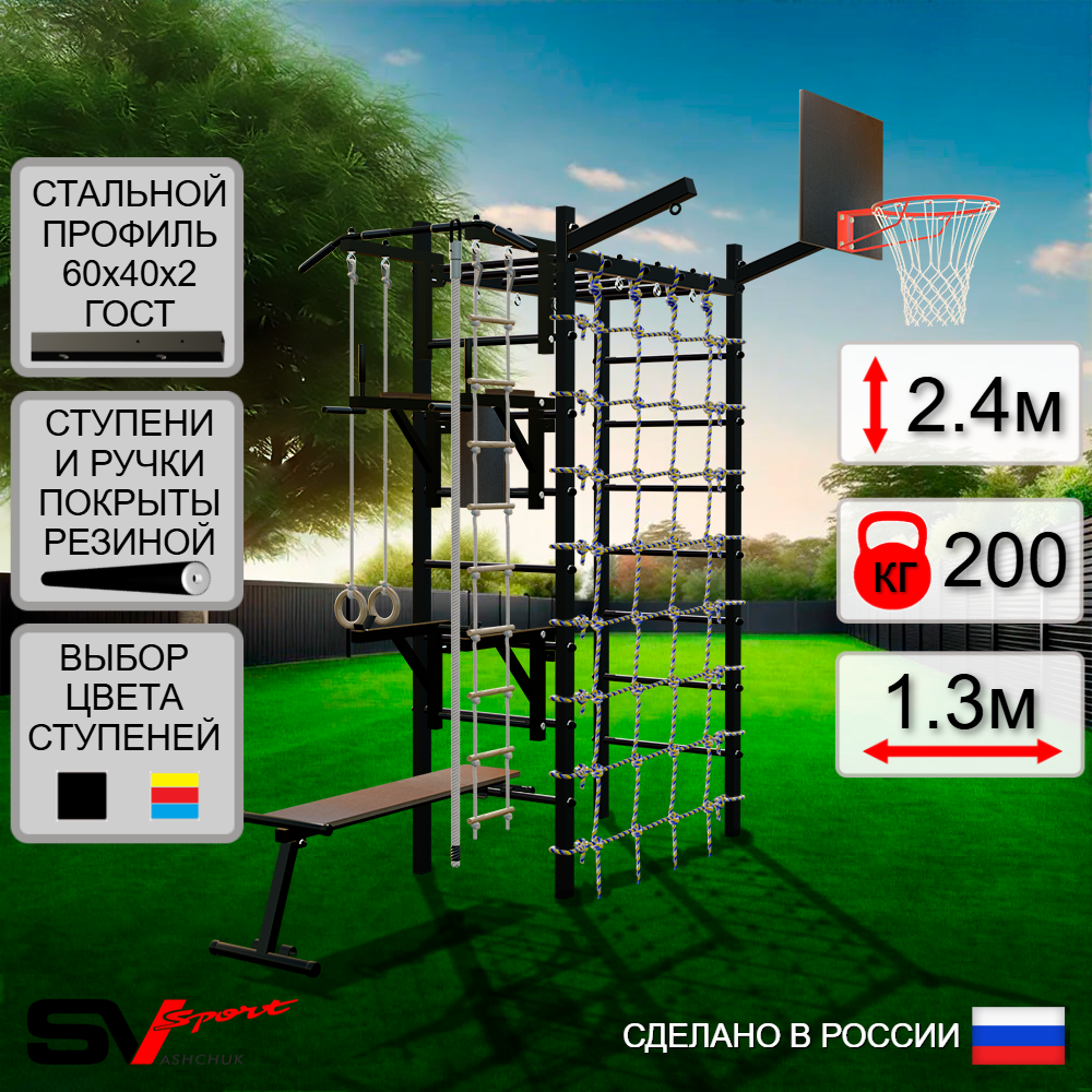 КОМПЛЕКТАЦИЯ: Каркас УСИК Sv Sport Рукоход, Турник Sv Sport стандарт к УШС, Брусья Sv Sport к УШС, Стойка под штангу Sv Sport к УШС, Скамья для пресса и жима Sv Sport к УШС, Щит баскетбольный Sv Sport c кронштейном к УШС Sv Sport, Кронштейн для подвеса боксерского мешка Sv Sport, Kанат, Kольца деревянные, Лестница веревочная, Сетка к спортивному комплексу.