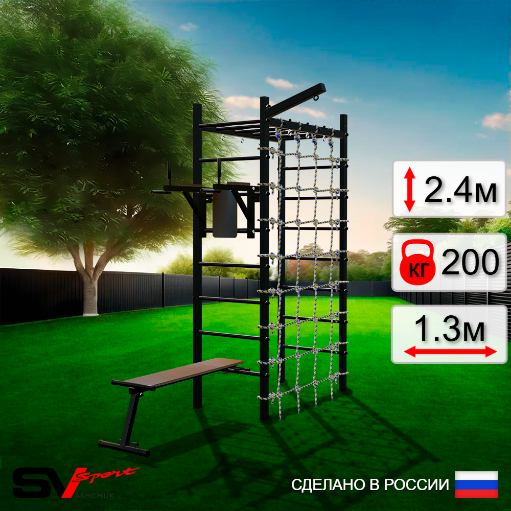 КОМПЛЕКТАЦИЯ: Каркас УСИК Sv Sport Рукоход, Брусья Sv Sport к УШС, Скамья для пресса и жима Sv Sport к УШС, Кронштейн для подвеса боксерского мешка Sv Sport, Сетка к спортивному комплексу.