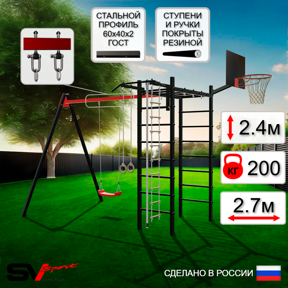 Уличный спортивно-игровой комплекс Sv Sport с качелями изготовлен из профильной трубы 60х40 мм, толщиной 3 мм (балка качелей), 2 мм (опоры и рукоход). Крепление опор изготовлено из пластины, толщиной 5 мм. Окрашен уличный спортивно-игровой комплекс качественной, импортной порошковой краской в 2 слоя, которая устойчива к истиранию и температурным перепадам. Все торцы, болты, гайки закрыты пластиковыми заглушками отличного качества. Использующиеся болты и гайки оцинкованы и соответствуют требованиям ГОСТ. Устанавливается спортивно-игровой комплекс путем бетонировки на глубину не менее 600 мм (опоры рукохода) и 400 мм (опоры качелей).