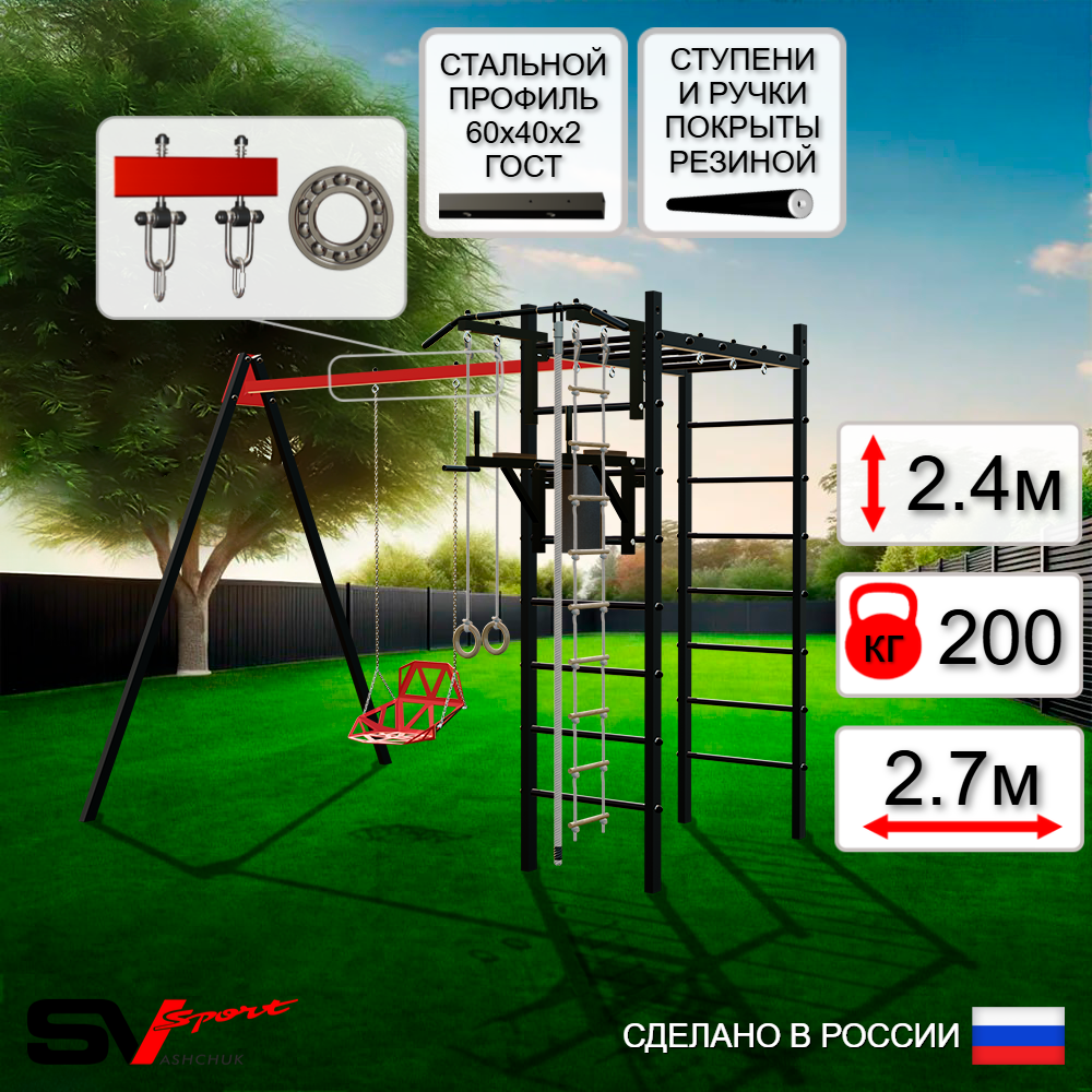 КОМПЛЕКТАЦИЯ: Каркас УСИК Sv Sport, Турник Sv Sport стандарт к УШС, Брусья Sv Sport к УШС, Качели пластиковые со спинкой на цепях, Подвесы для качелей на подшипниках Sv Sport, Kанат, Kольца деревянные, Лестница веревочная.