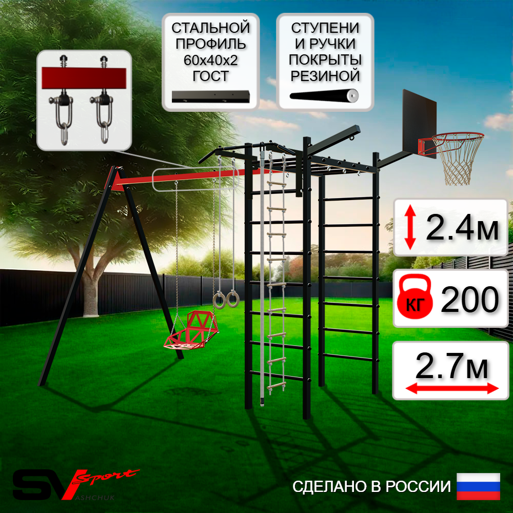 КОМПЛЕКТАЦИЯ: Каркас УСИК Sv Sport, Турник Sv Sport стандарт к УШС, Качели пластиковые со спинкой на цепях, Подвесы для качелей на втулках Sv Sport, Щит баскетбольный Sv Sport c кронштейном к УШС Sv Sport, Кронштейн для подвеса боксерского мешка Sv Sport, Kанат, Kольца деревянные, Лестница веревочная.