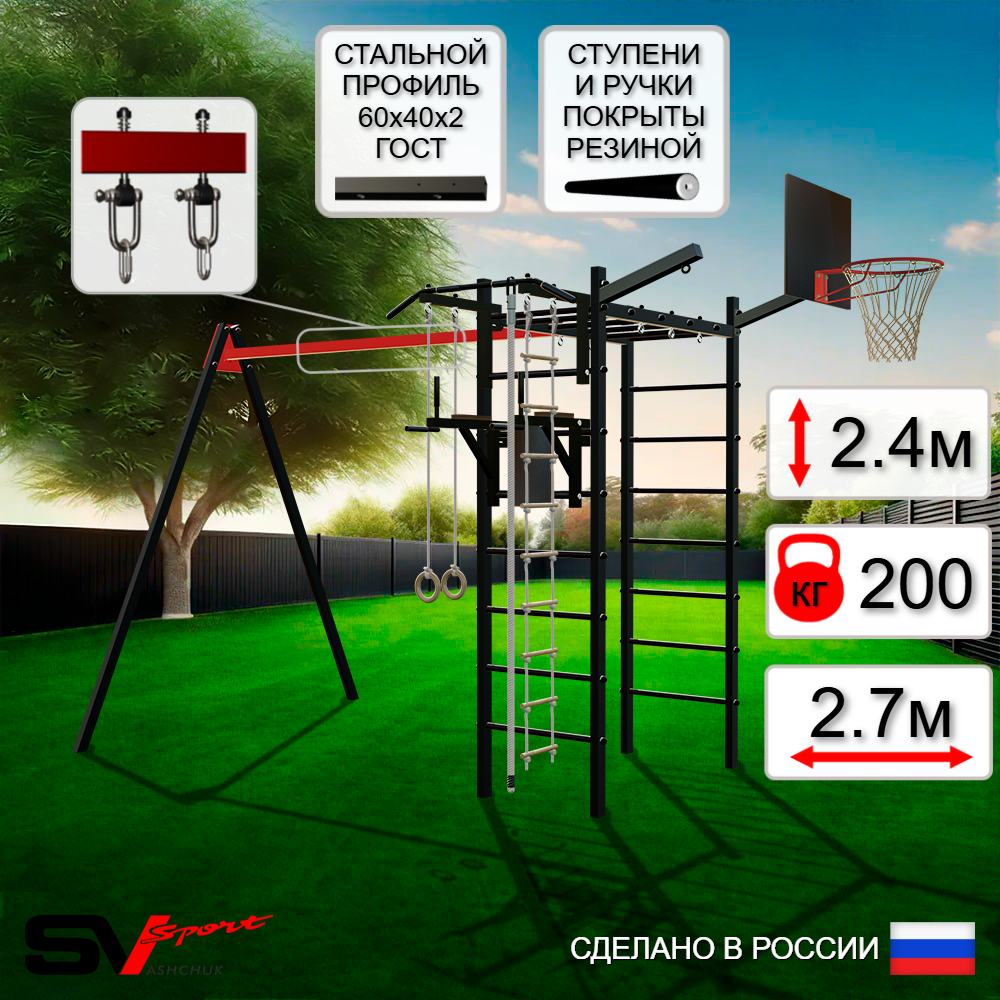 КОМПЛЕКТАЦИЯ: Каркас УСИК Sv Sport, Турник Sv Sport стандарт к УШС, Брусья Sv Sport к УШС, Подвесы для качелей на втулках Sv Sport, Щит баскетбольный Sv Sport c кронштейном к УШС Sv Sport, Кронштейн для подвеса боксерского мешка Sv Sport, Kанат, Kольца деревянные, Лестница веревочная.
