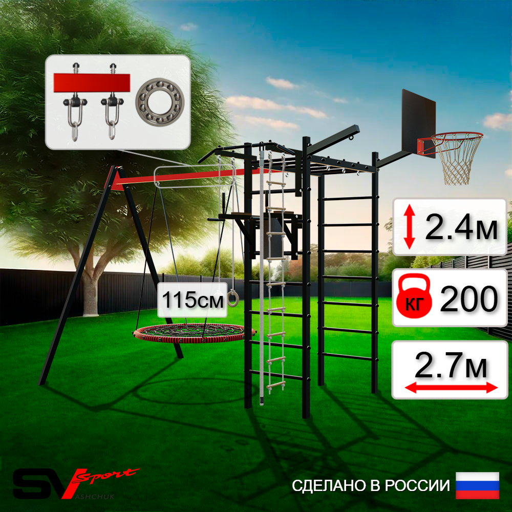 КОМПЛЕКТАЦИЯ: Каркас УСИК Sv Sport, Турник Sv Sport стандарт к УШС, Брусья Sv Sport к УШС, Качели - гнездо 115см, Подвесы для качелей на подшипниках Sv Sport, Щит баскетбольный Sv Sport c кронштейном к УШС Sv Sport, Кронштейн для подвеса боксерского мешка Sv Sport, Kанат, Kольца деревянные, Лестница веревочная.