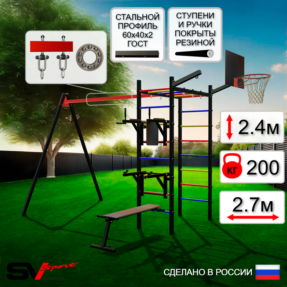 КОМПЛЕКТАЦИЯ: Каркас УСИК Sv Sport, Брусья Sv Sport к УШС, Стойка под штангу Sv Sport к УШС, Скамья для пресса и жима Sv Sport к УШС, Подвесы для качелей на подшипниках Sv Sport, Щит баскетбольный Sv Sport c кронштейном к УШС Sv Sport, Кронштейн для подвеса боксерского мешка Sv Sport.
