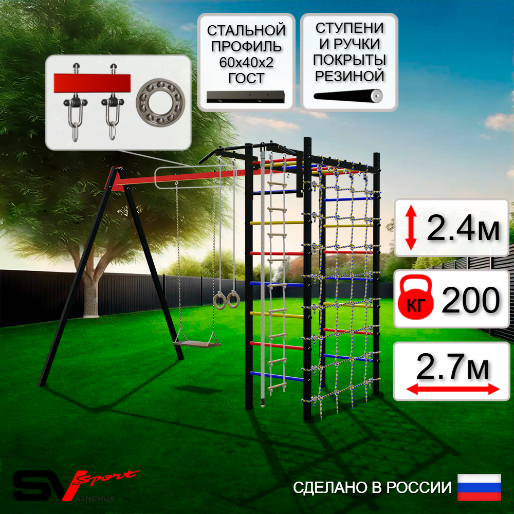 КОМПЛЕКТАЦИЯ: Каркас УСИК Sv Sport, Турник Sv Sport стандарт к УШС, Качели деревянные на цепях Sv Sport, Подвесы для качелей на подшипниках Sv Sport, Kанат, Kольца деревянные, Лестница веревочная, Сетка к спортивному комплексу.