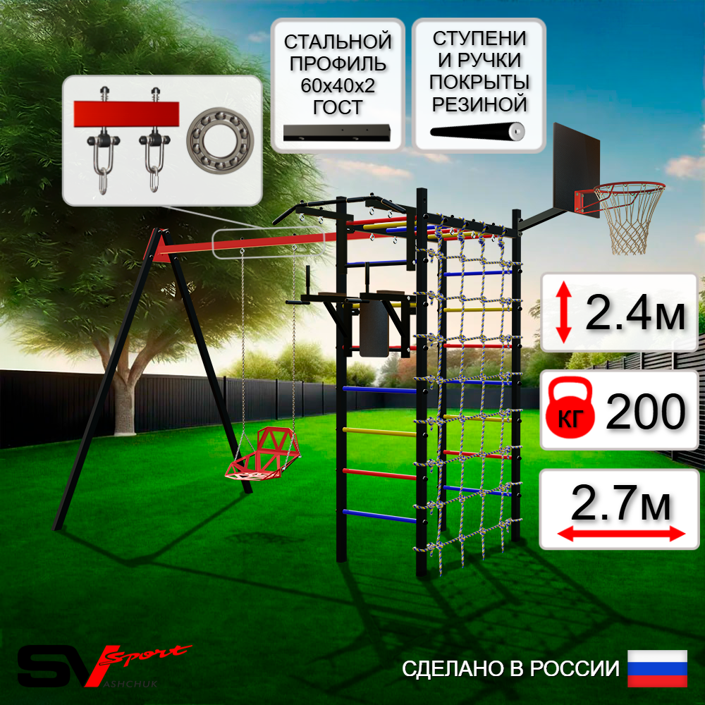 КОМПЛЕКТАЦИЯ: Каркас УСИК Sv Sport, Турник Sv Sport стандарт к УШС, Брусья Sv Sport к УШС, Качели пластиковые со спинкой на цепях, Подвесы для качелей на подшипниках Sv Sport, Щит баскетбольный Sv Sport c кронштейном к УШС Sv Sport, Сетка к спортивному комплексу.
