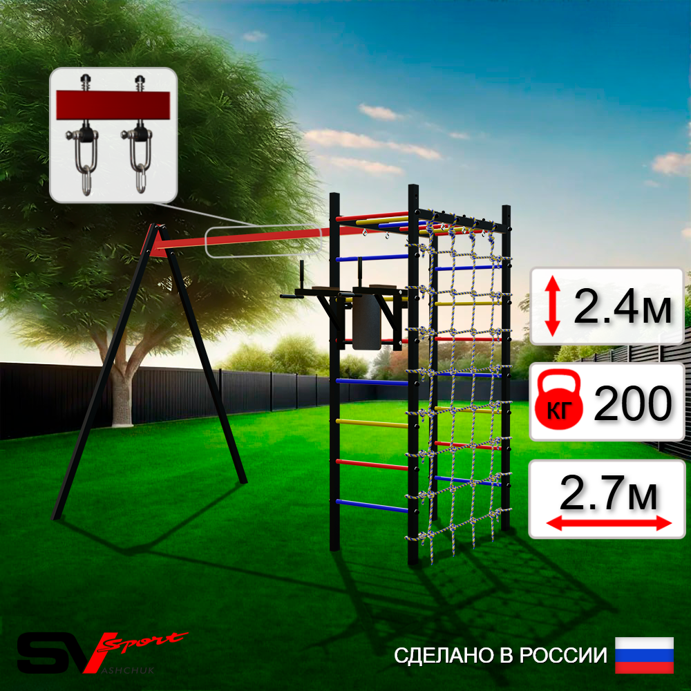 КОМПЛЕКТАЦИЯ: Каркас УСИК Sv Sport, Брусья Sv Sport к УШС, Подвесы для качелей на втулках Sv Sport, Сетка к спортивному комплексу.