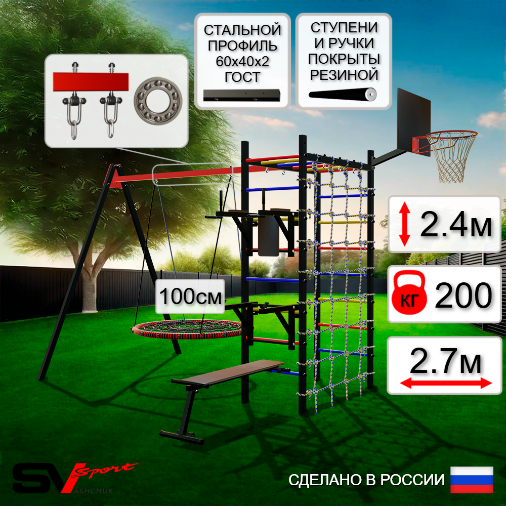 КОМПЛЕКТАЦИЯ: Каркас УСИК Sv Sport, Брусья Sv Sport к УШС, Стойка под штангу Sv Sport к УШС, Скамья для пресса и жима Sv Sport к УШС, Качели - гнездо 100см, Подвесы для качелей на подшипниках Sv Sport, Щит баскетбольный Sv Sport c кронштейном к УШС Sv Sport, Сетка к спортивному комплексу.