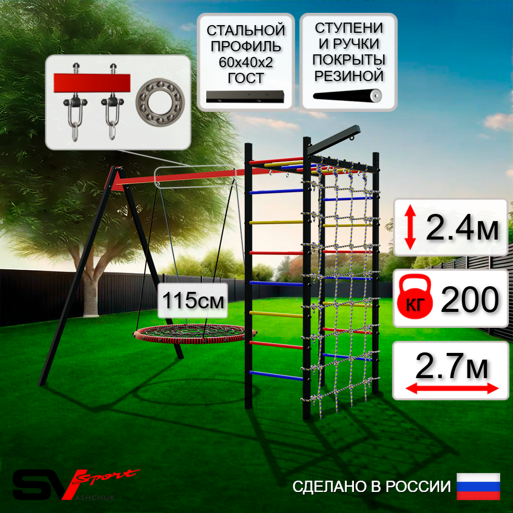 КОМПЛЕКТАЦИЯ: Каркас УСИК Sv Sport, Качели - гнездо 115см, Подвесы для качелей на подшипниках Sv Sport, Кронштейн для подвеса боксерского мешка Sv Sport, Сетка к спортивному комплексу.