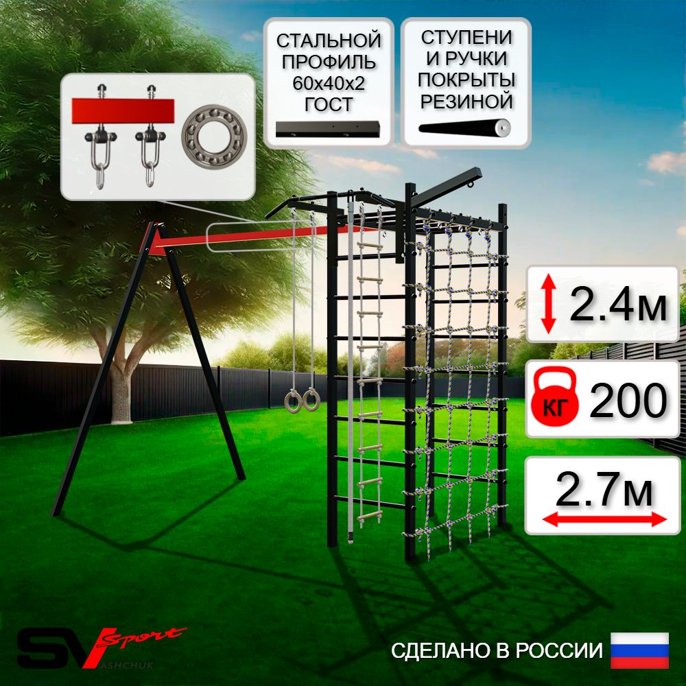 КОМПЛЕКТАЦИЯ: Каркас УСИК Sv Sport, Турник Sv Sport стандарт к УШС, Подвесы для качелей на подшипниках Sv Sport, Кронштейн для подвеса боксерского мешка Sv Sport, Kанат, Kольца деревянные, Лестница веревочная, Сетка к спортивному комплексу.