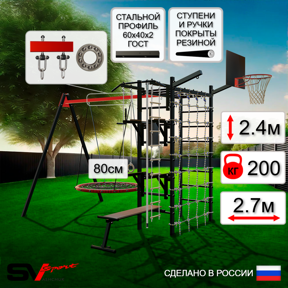 КОМПЛЕКТАЦИЯ: Каркас УСИК Sv Sport, Турник Sv Sport стандарт к УШС, Брусья Sv Sport к УШС, Стойка под штангу Sv Sport к УШС, Скамья для пресса и жима Sv Sport к УШС, Качели - гнездо 80см, Подвесы для качелей на подшипниках Sv Sport, Щит баскетбольный Sv Sport c кронштейном к УШС Sv Sport, Кронштейн для подвеса боксерского мешка Sv Sport, Kанат, Kольца деревянные, Лестница веревочная, Сетка к спортивному комплексу.