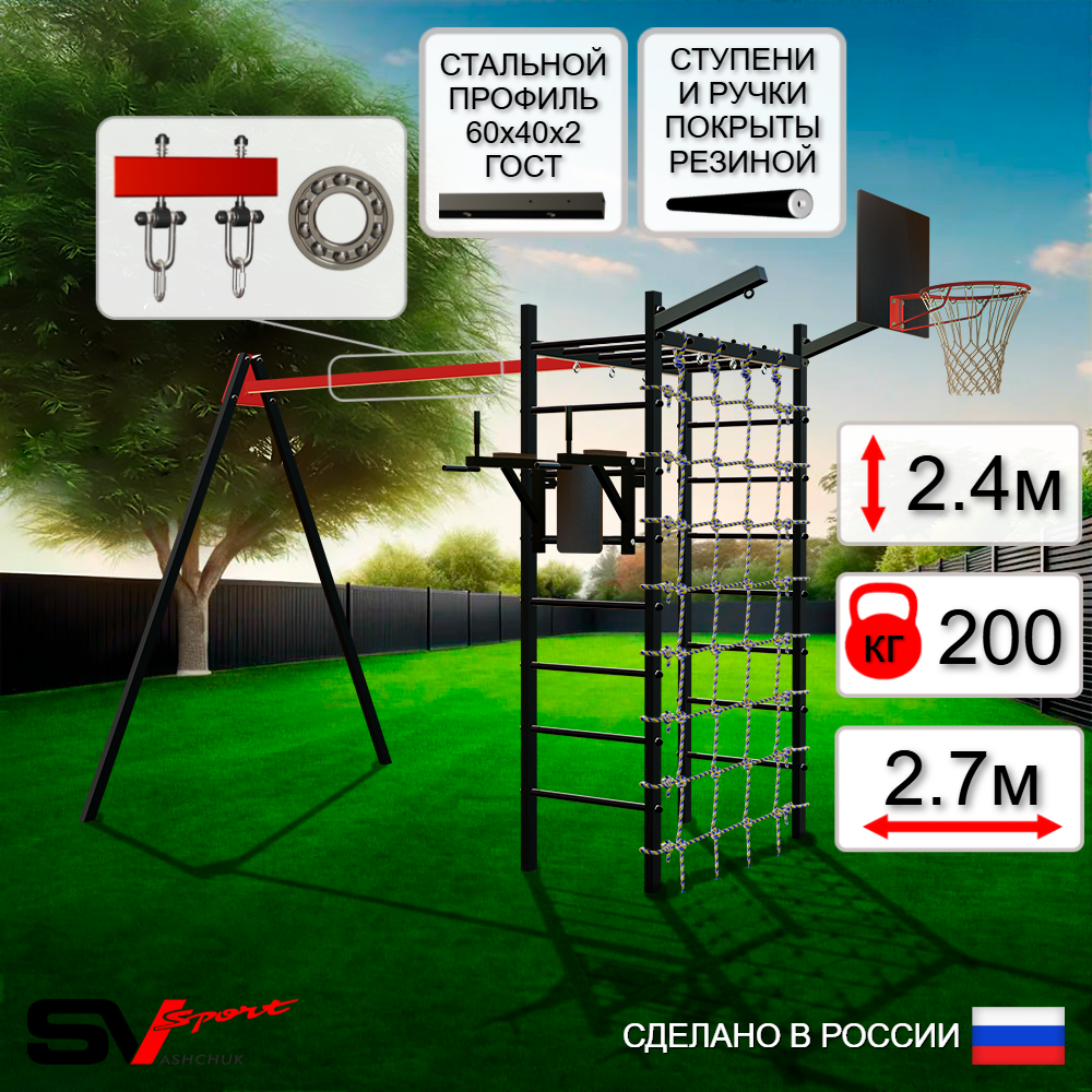 КОМПЛЕКТАЦИЯ: Каркас УСИК Sv Sport, Брусья Sv Sport к УШС, Подвесы для качелей на подшипниках Sv Sport, Щит баскетбольный Sv Sport c кронштейном к УШС Sv Sport, Кронштейн для подвеса боксерского мешка Sv Sport, Сетка к спортивному комплексу.