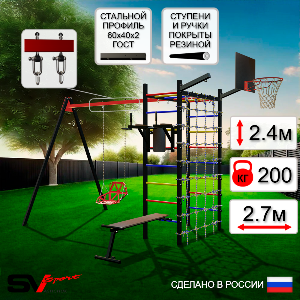КОМПЛЕКТАЦИЯ: Каркас УСИК Sv Sport, Брусья Sv Sport к УШС, Скамья для пресса и жима Sv Sport к УШС, Качели пластиковые со спинкой на цепях, Подвесы для качелей на втулках Sv Sport, Щит баскетбольный Sv Sport c кронштейном к УШС Sv Sport, Кронштейн для подвеса боксерского мешка Sv Sport, Сетка к спортивному комплексу.