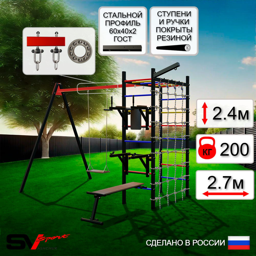 Уличный спортивно-игровой комплекс Sv Sport с качелями изготовлен из профильной трубы 60х40 мм, толщиной 3 мм (балка качелей), 2 мм (опоры и рукоход). Крепление опор изготовлено из пластины, толщиной 5 мм. Окрашен уличный спортивно-игровой комплекс качественной, импортной порошковой краской в 2 слоя, которая устойчива к истиранию и температурным перепадам. Все торцы, болты, гайки закрыты пластиковыми заглушками отличного качества. Использующиеся болты и гайки оцинкованы и соответствуют требованиям ГОСТ. Устанавливается спортивно-игровой комплекс путем бетонировки на глубину не менее 600 мм (опоры рукохода) и 400 мм (опоры качелей).