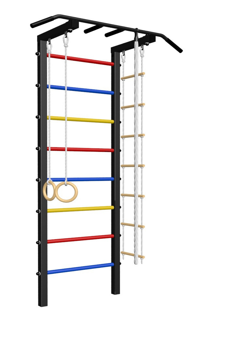 - Комплект: канат с крепежом, кольца гимнастические деревянные, лестница веревочная