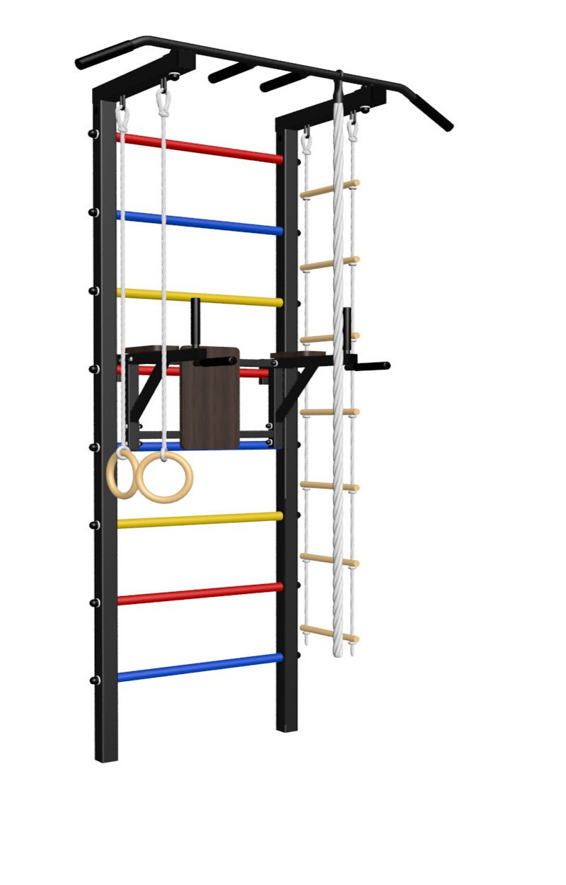 - Комплект: канат с крепежом, кольца гимнастические деревянные, лестница веревочная