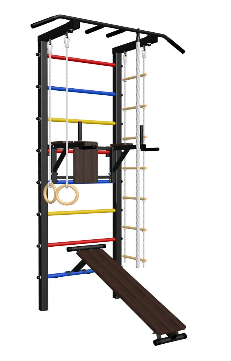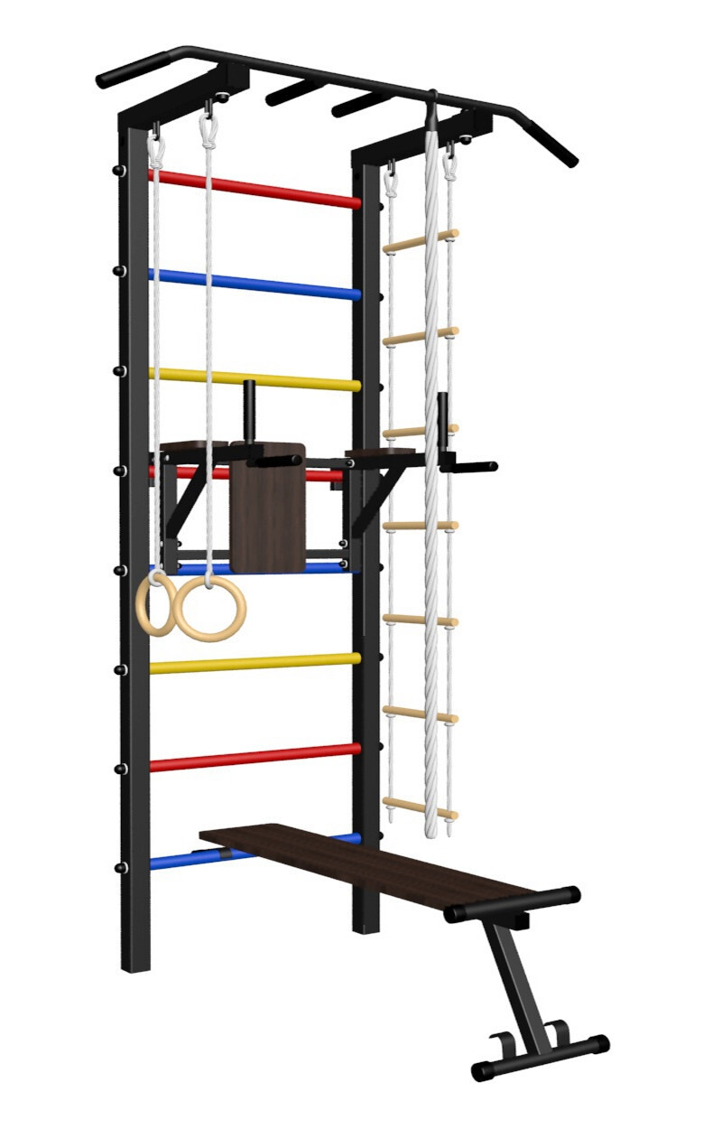 - Комплект: канат с крепежом, кольца гимнастические деревянные, лестница веревочная