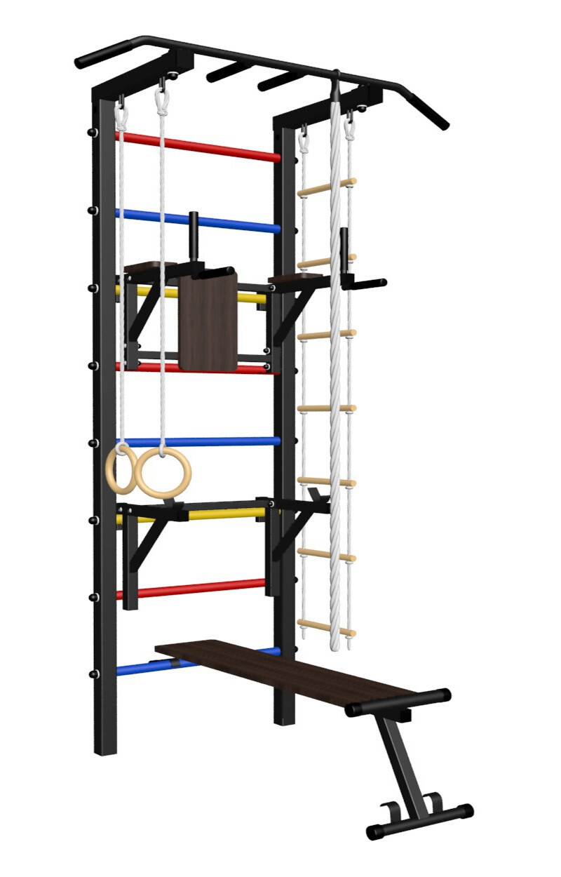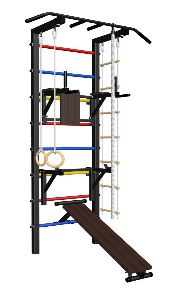 - Комплект: канат с крепежом, кольца гимнастические деревянные, лестница веревочная