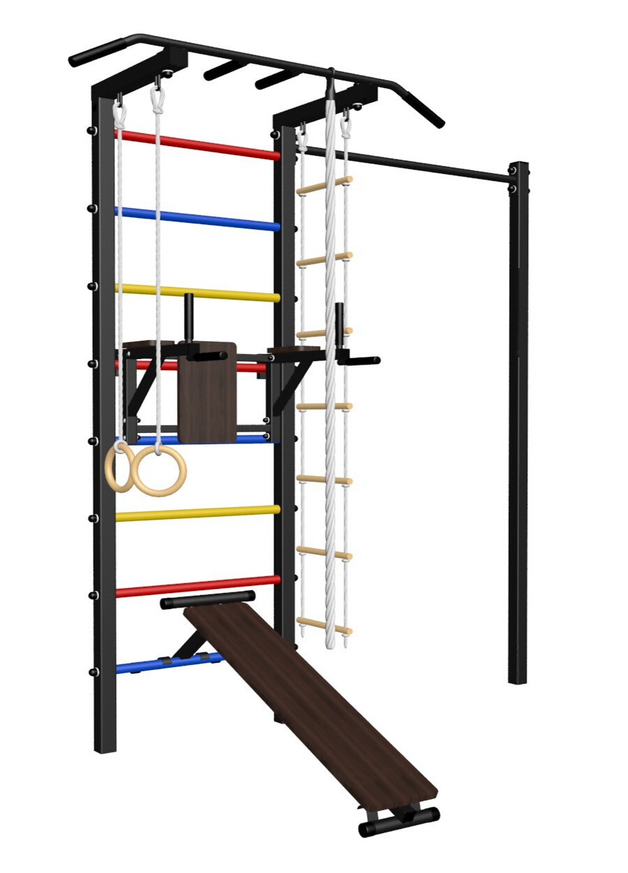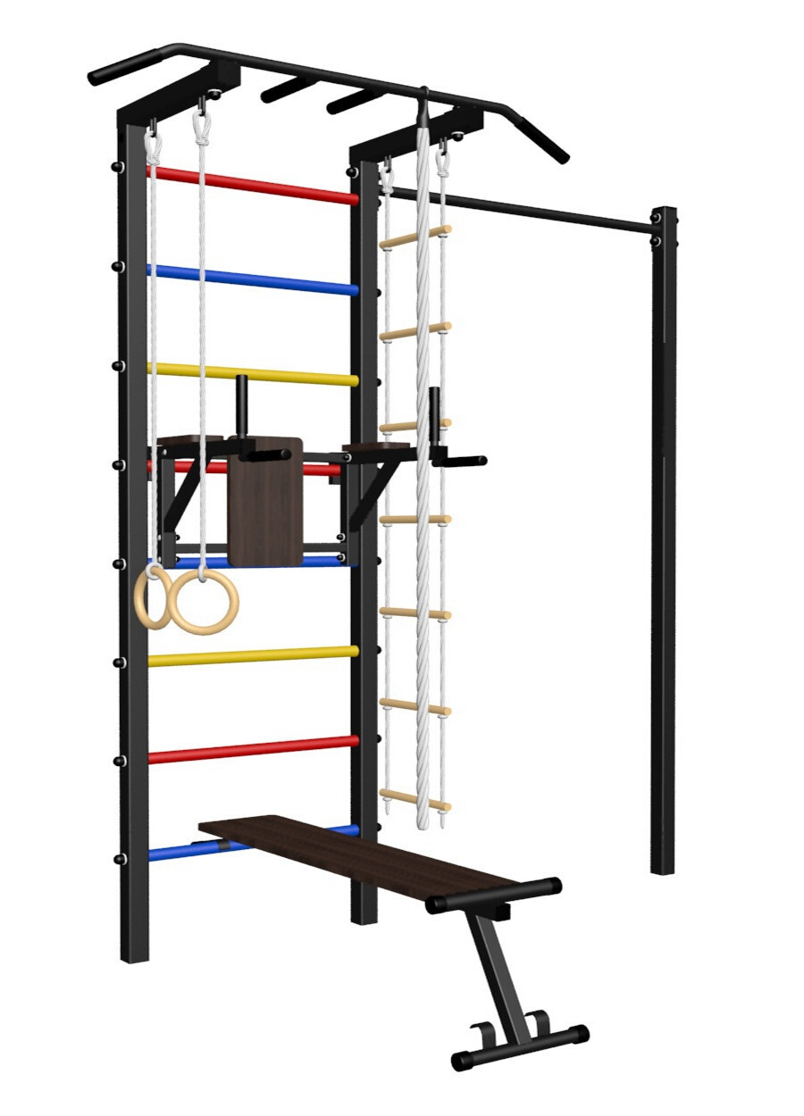 - Комплект: канат с крепежом, кольца гимнастические деревянные, лестница веревочная