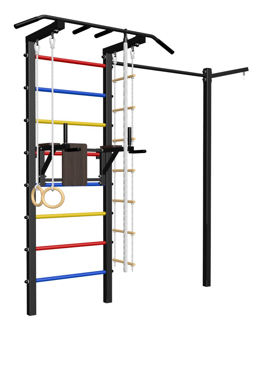 - Комплект: канат с крепежом, кольца гимнастические деревянные, лестница веревочная